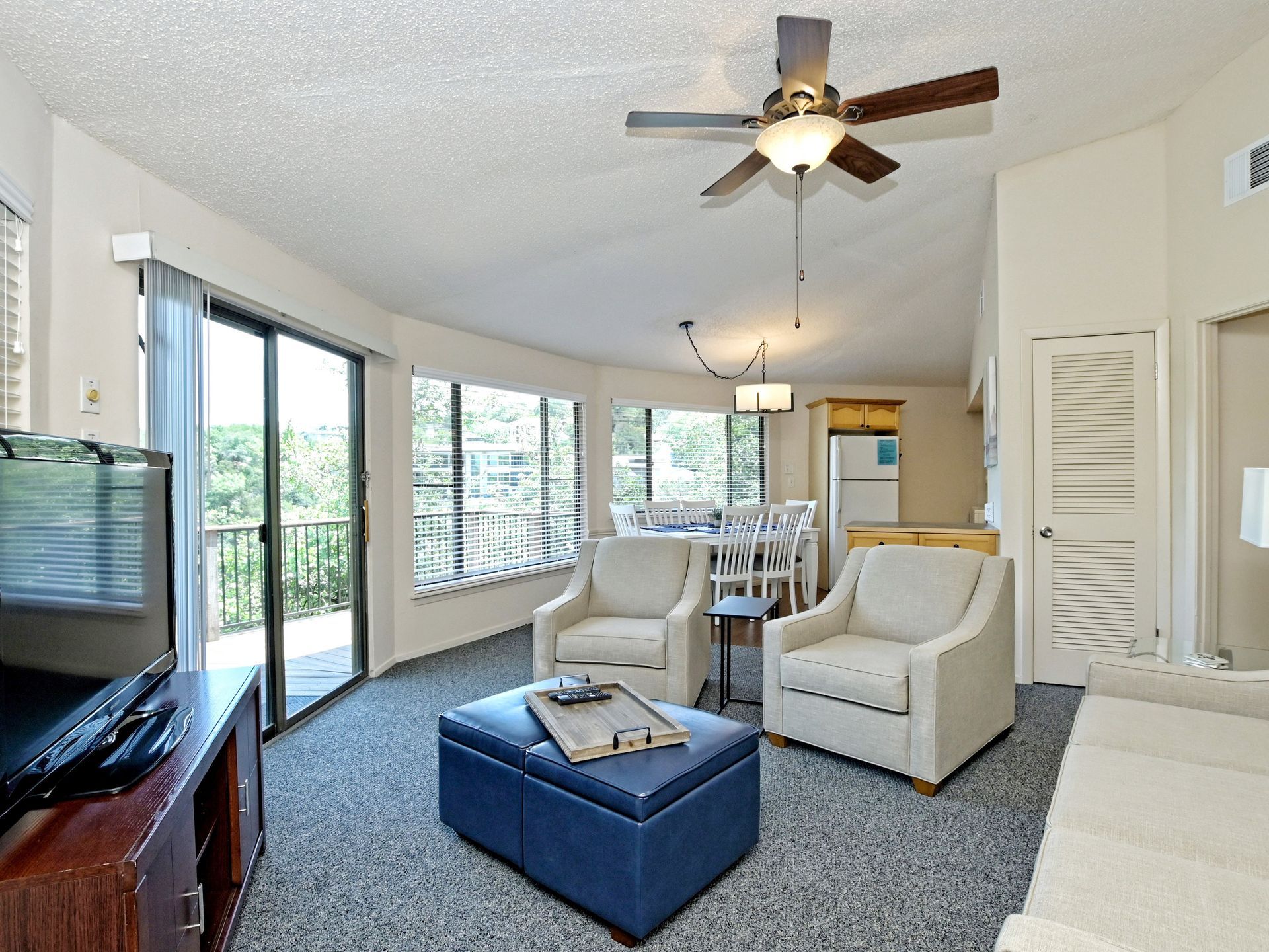 Experience this hidden gem of greater Austin - a collection of fully furnished bungalows nestled right on the banks of Lake Travis. Each unit, boasting two bedrooms and two full bathrooms, can comfortably accommodate up to six guests, with a queen sleeper sofa in the living room. Enjoy panoramic views of the pristine lake from the comfort of the wrap-around decks. Unwind in our exquisite cave deck swimming pool and hot tub, a true marvel to behold.